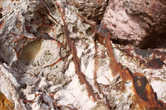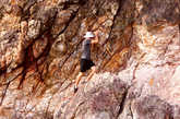 Стенка двора у нас практически прямая, но лазать по ней не трудно. Очень много трещин и щелей, есть за что ухватиться. Правда можно руку порезать. Обо что? О железо... Откуда же здесь может быть железо? Когда то вулкан выплеснул лаву. Лава остывании растрескалась. При более поздних извержениях трещины были залечены расплавленным железом, которое в них застыло.