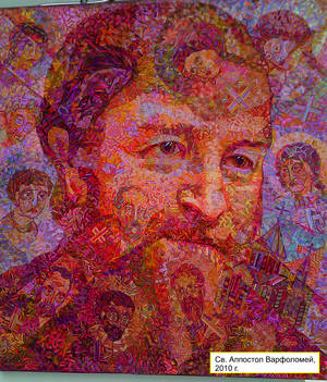 Потратьте несколько минут, чтобы посмотреть эту коллекцию. Обратите внимание на многослойность изображений, когда из отдельных образов в комплексе вырисовывается общее понимание картины. В основе – метод аппликаций – «мозаичной цветописи». Автор сначала наносит на холст контурное представление о композиции, а затем из отдельных цветовых решений выстраивает образы. Думаю, на фрагментарных фото вы поймете структуру образов. Иногда картина может состоять из 20 000 аппликаций.