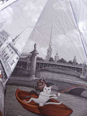 Ну конечно же — это кошки. В эту поездку мне чего-то захотелось уделить им немного больше внимания, чем обычно. Оказывается, в Санкт-Петербурге кошки выделены в отдельную "культурно-художественную" прослойку. Есть магазинчики, торгующие исключительно картинками и открытками с этим милым животным, кто-то из художников придумал раскрашивать в котов матрёшки. А один из мастеров Питерского завода, производящего зонты, посвятил этой весёленькой теме своё произведение. Пришлось купить)))