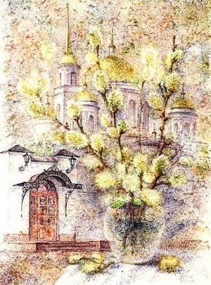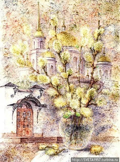 На любой выставке, мысленно для себя, всегда выделяешь что-то такое, что особенно понравилось и сразу запомнилось. Так и здесь: пейзаж с вербой у нас зрителей особенно откликнулся в душе. И далее, захотелось пофантазировать, додумать, что подтолкнуло художницу создать данный сюжет. Как будто из окна своего дома, весенним утром, заварив чудесно-ароматный чай, она, вдруг, медленно отставив чашку в сторону, мягко переместилась к мольберту, чтобы перенести внезапно открывшийся ей сюжет за окном на холст. Наполнила ее своей душой и светом.