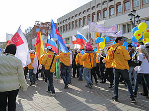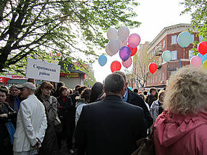 Сбор был у "Дома книги", что на проспекте Кирова. Ждали старт целый час, в 9часов 30 минут двинулись по улице Вольской до улицы Московской. Но когда подошли к театральной площади, где обычно проходили демонстрации и парады, нас никто не пустил на площадь. Там нас не ждали и колонна прошествовала до ул. Радищева, свернула и по ней дошла до парка "Липки". На этом и закончился праздник. Специальных поздравлений с трибун мы не наблюдали. Немного не доходя до Липок, с небольшой трибуны с правой стороны, кто-то выкрикивал поздравления и пожелания. Правда охрана демонстрантов была усиленной, через каждые пять метров стояли курсанты и полиция. А при входе на проспект Кирова,перед началом демонстрации, нас всех проверяли на предмет взрывчатки, газовых баллончиков и ещё чего-то.