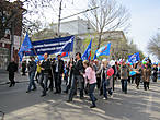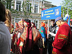 Не думала, что сегодня так много народу будет на празднике. Много коллективов пришли с плакатами- требованиями, рекламными транспарантами. А многие просто несли шарики надувные, флажки, флаги и радовались наступившим праздникам. Позади нашего управления шёл отдел культуры. Весёлый народ, хочу сказать. Они нас и веселили. Играла у них гармонь,пел и танцевал собравшийся коллектив в национальных костюмах.