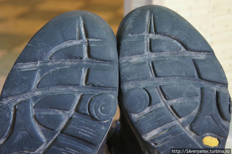 Промокшие и высушенные на костре десятки раз, испытавшие арктический холод и тропический зной, они остались снаружи и внутри совершенно целыми и ещё не потеряли бодрого вида, но протектор стёрся, подошва стала гладкой и напоминает теперь лысую покрышку автомобиля.
