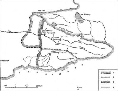 Рис. 8. Схема Илийского края 1 — граница России и Илийского края, занятого в 1871-1881 гг. царскими войсками; 2 — граница до занятия Илийского края царскими войсками; 3 — граница по Петербургскому договору 1881 г.; 4 — граница по Ливадийскому договору 1879 г. (А.Л. Нарочницкий. «Колониальная политика капиталистических держав на Дальнем Востоке. 1860-1895». М., 1956. С. 237) Фото из Интернета