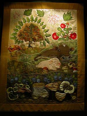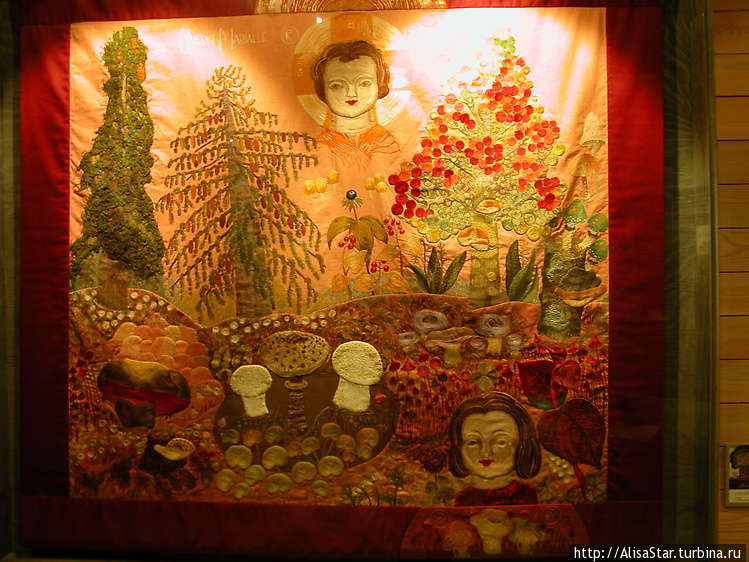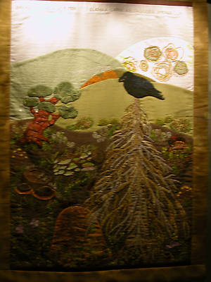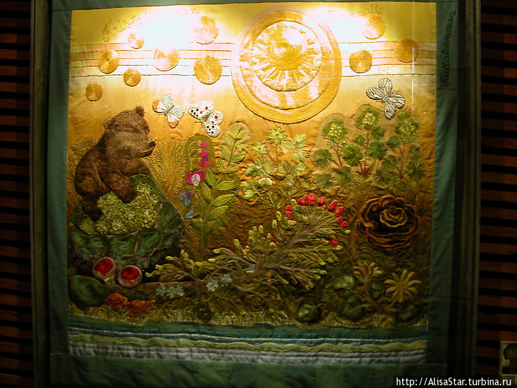 Пункахарью.Работы, напоминающие лоскутное шитье из текстиля, сделаны на тематику природы и сказок. Главными героями этих загадочных сюжетов являются животные: лягушки и коровы!