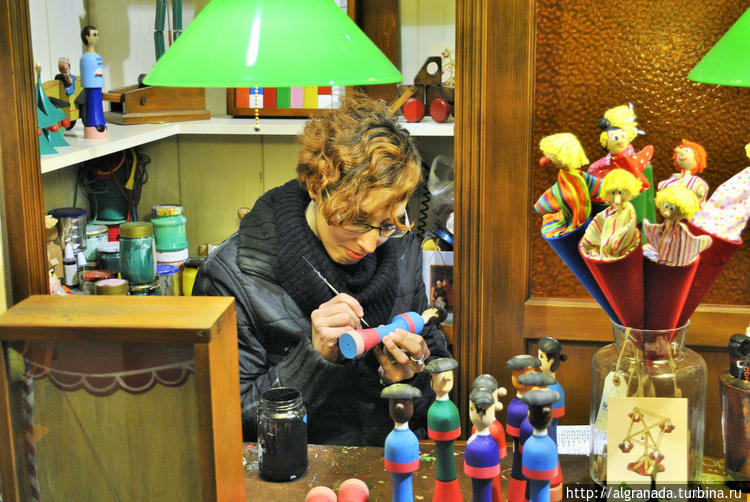 Оглядевшись я увидела за прилавком девушку, которая сидела и расписывала деревянного солдатика. Мы разговорились. Алисия, так звали хозяйку, рассказала мне, что ее родители начали изготавливать игрушки уже больше тридцати лет назад, сначала это было хобби, потом стали предлагать их на ярмарках. Сама Алисия, закончив факультет изобразительного искусства и дизайна в Гранаде, решила пару лет назад открыть магазинчик, в котором можно увидеть ее творческие и в какой-то степени ностальгические работы.