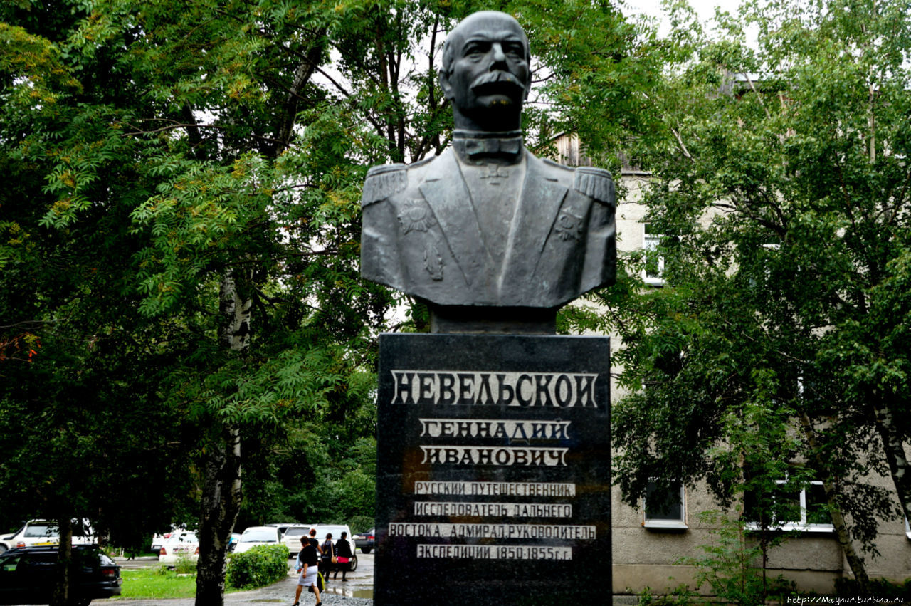 Русский путешественник и исследователь Дальнего Востока, адмирал, руководитель экспедиции 1850 — 1855 гг. он очень любим и особо почитаем островитянами. Памятников ему множество. Несколько памятников установлено в самом Невельске.Один из памятников, связанный с печальными событиями, установлен в сквере на привокзальной площади.