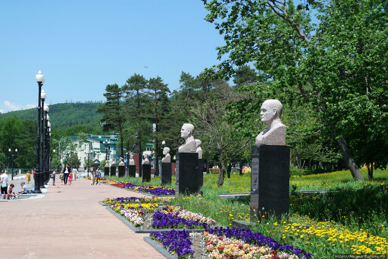 Во всех скверах по ул. Сахалинской установлены бюсты известных путешественников и исследователей дальневосточных берегов, берегов Сахалина и Курильских островов.