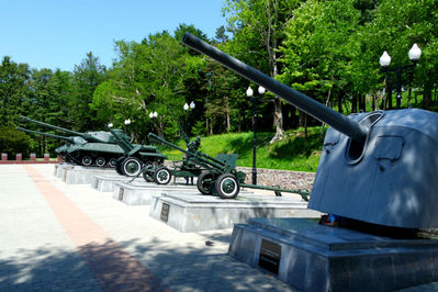 Тема Великой Отечественной войны в виде памятников отражена в городе в большом количестве. Война по освобождению Сахалина и Курильских островов была непродолжительной, но жертв собрала много.