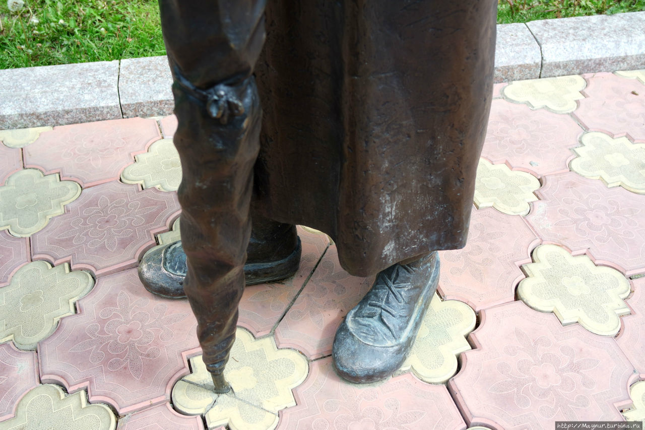 Возле Чехов — центра стоит памятник типичному чеховскому герою с зонтом в руках и галошах.