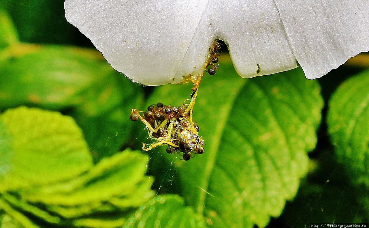 Было это в конце июля в одном из пригородных парков. Прогуливаясь по аллее, я случайно обратил внимание на белый цветок, то был обычный повой, что из семейства вьюнковых. Цветок, как цветок, такой растёт всюду. И, вероятно, прошел бы я мимо, но нечто остановило меня. Странного вида образование прилепилось к цветку. Пригляделся, благо фотоаппарат был со мной, удалось увеличить картинку.