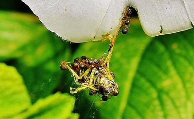 И действительно, на самом кончике белого лепестка, зацепившись скрученной паутиной, болталось, раскачиваясь на ветру, скопление паучат, только что народившихся. Молодь интенсивно работала лапками, пытаясь освободиться от остатков паутины. Особо бойким это удавалось, и они, как цирковые акробаты, ловко устремлялись по паутине наверх, к цветку. Другие, вероятно, завидовали своим собратьям, однако надежд не теряли, и с удвоенной силой работали, не покладая лап.