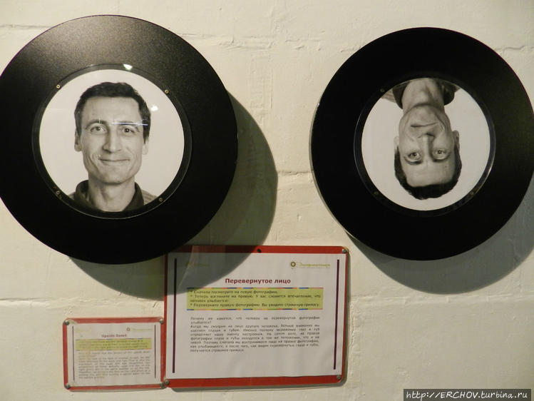 Ещё раз смотрим на его перевёрнутую фотографию. Теперь переворачиваем фото, и видим уже совсем другую картину. Думаю, про улыбку говорить сложно, это скорее гримаса. В данном случае это один из экспонатов музея Экспериментариум —