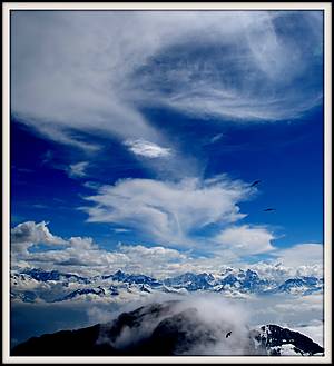 Когда разбирал фото, увидел этот снимок. Подумал, что странные какие-то облака. А потом вспомнил, что снимок сделан на горе Пилатус. На переднем плане снег, на заднем облака.