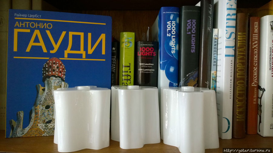 Вернувшись с Байкала, я разобрала один из наших светильников и водрузила плафоны на книжную полку рядом с книгой о Гауди.