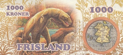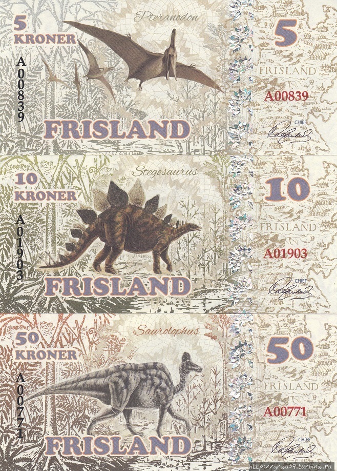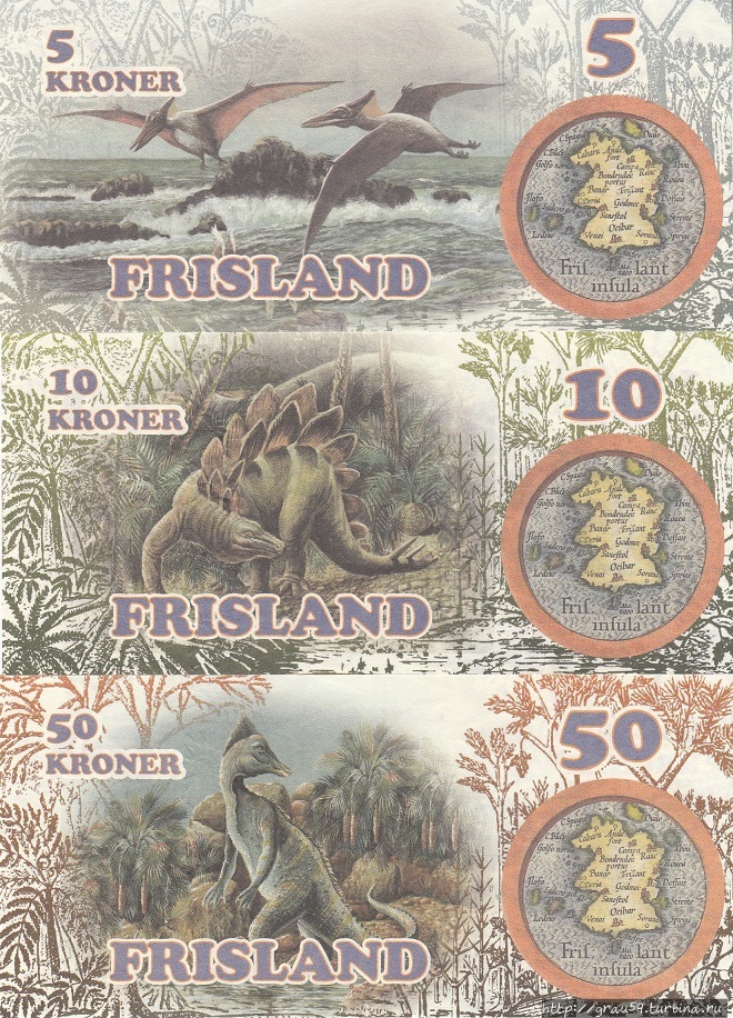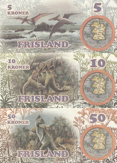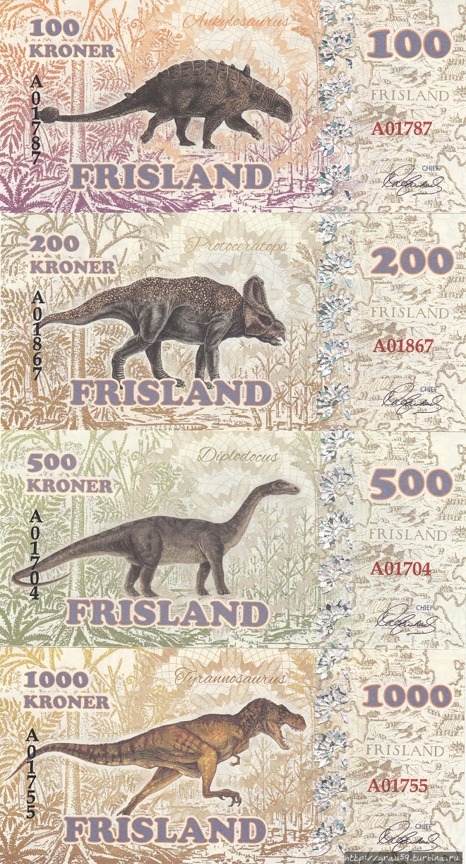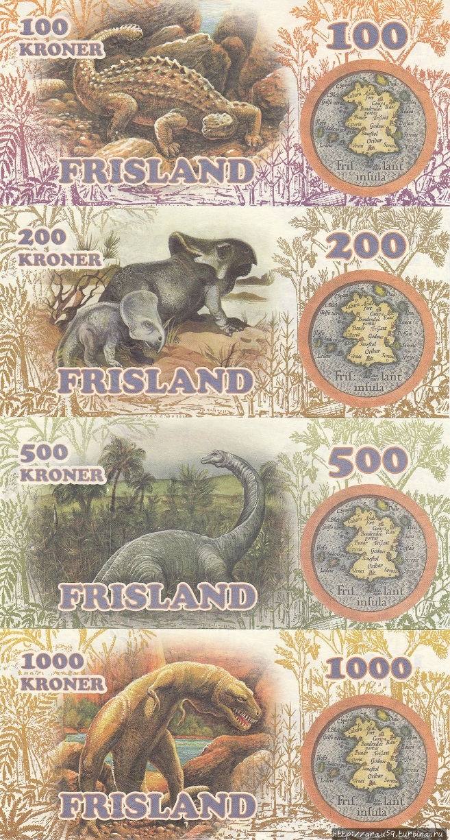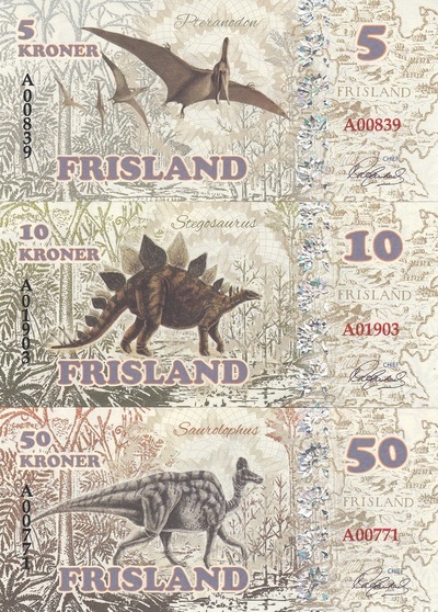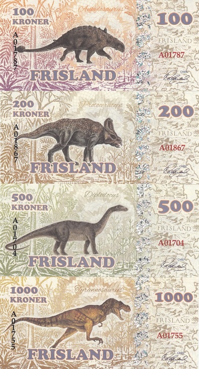 100, 200, 500 и 1000 крон.На них изображены, идём по возрастанию номиналов: Птеранодон, Стегозавр, Зауролоф, Анкилозавр, Протоцератопс, Диплодок и Тираннозавр.