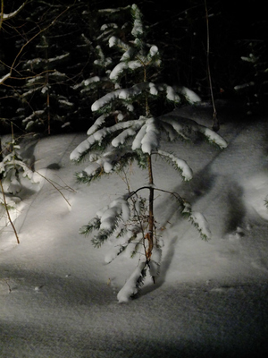 Рассказывать особо и не о чем. Ничего там, в лесу, не приключилось. Невиданных зверей или их следов на пути не встретилось. Трудностей в пути тоже не возникло. Было полнейшее умиротворение от тишины и высоченных деревьев вокруг. Деревья молчали, заснеженными макушками упираясь прямо в тёмное небо!