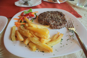 Одно из национальный балканских блюд — плескавица — котлета из рубленого мяса, поджаренная на гриле. Кроме обычной котлеты есть разновидность фаршированной, но мне оригинал понравился больше. Обычно, кроме плескавицы, подается немного овощей и картофель фри.