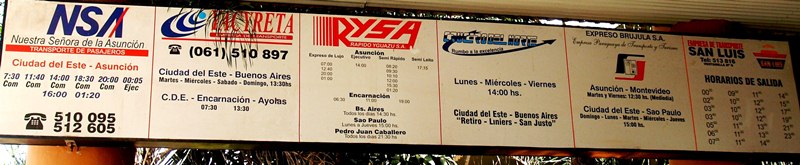 Автовокзал Сидад-дэль-Эсте), как и полагается, меньше чем в столице, но больше чем в Энкарнасьоне. Чище чем оба. Порадовал удобной планировкой и щитами у входа, на которых выписаны отправления всех компаний по всем направлениям. В одном месте! Наверное, это эксклюзив не только в Парагвае, а вообще в Южной Америке. Во всяком случае, в намного более прозрачной Бразилии встречал такое только в аэропортах.