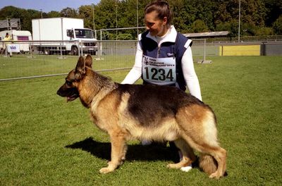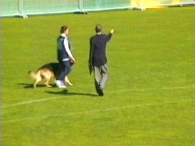 Теперь можно было расслабиться и прийти в себя. Следующая процедура уже не выглядела такой волнительной – описание экстерьера происходит в спокойной обстановке почти без зрителей. Мы нашли футбольное поле, где главный судья чемпионата и председатель союза владельцев немецкой овчарки описывал экстерьер кобелей рабочего класса.