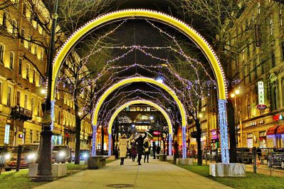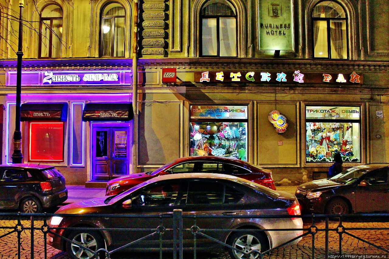 Гуляя как-то по вечернему Санкт-Петербургу моё внимание привлекли две рекламные вывески, установленные на фасаде одного здания. Первая предлагала услуги исключительно развлекательного характера, а вторая – товары ширпотреба, куртки, джинсы, обувь и трикотаж.