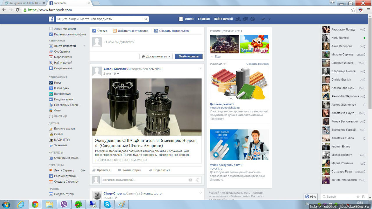 Дальше переходим к самому успешному интернет — проекту последнего времени, а именно к фейсбуку. Последовательность действий здесь такая же. Кликаем на иконку и "одобряем" всплывающее окно.
