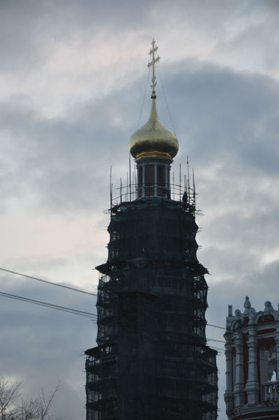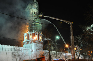Поздним вечером в воскресенье загорелись строительные леса на колокольне в Новодевичьем монастыре.