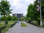 Там ещё балкон был большой. Вообще не возникло ощущения, что это квартира! Вечером с детьми погуляли по бульвару. Это тут, около ангела, он не совсем доделанный (но зато здесь удобней кататься на самокатах!); другая часть – это клумбы и памятник Гагарину… И всюду ягоды и снегири на фонарях :)