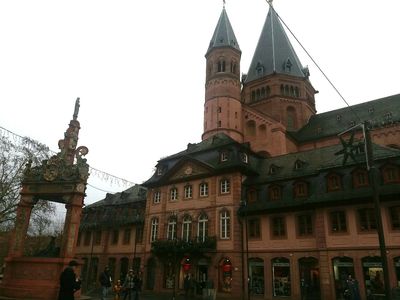 1 января, проснувшись к обеду, мы решили посетить нашу земельную столицу — Майнц. Было пасмурно и уныло, но душа требовала. Сначала мы прошлись вдоль Рейна и свернули к собору. В центре было открыто несколько кафе , в одно из них с видом на Домский собор мы и зашли. Есть абсолютно не хотелось. Кофе вернул нас к жизни, по крайней мере меня. Поболтав недолго со словоохотливыми соседями о собаках и погоде, мы пошли обратно на вокзал. В центре практически не было людей, "сидят по домам и доедают, что осталось", подумала я, но потом вспомнила, что немцы на Новый год не чревоугодничают.