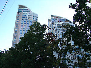 Отвлекусь и скажу: Эти две высотки напоминают мне еще один образ: белокрылую речную чайку, изящно парящую над рекой и любующуюся видами седого Днепра и древнего и вечно молодого Киева.