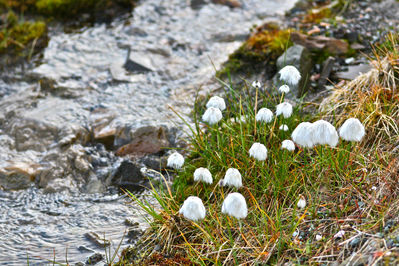 В конце августа, когда мы были на Шпицбергене, лето как раз вступило в свои права и пущица цвела вовсю, занимая любые возможные для себя места, особенно там, где земля больше прогревается на открытых участках и еще там, где стоят неглубокие лужи — вода в полярный день хорошо прогревается от практически не заходящего за горизонт Солнца.