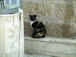 Яркий и юный древний город - Иерусалим, не было пешеходов.Рестораны и магазины не работали. Только одинокая кошка грустно смотрела на нас. Сегодня она осталась без еды...