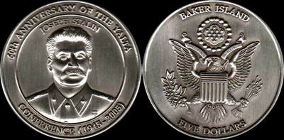 Монета из серии "60 лет Ялте". Черчилль и Председатель Совета Народных Комиссаров СССР Иосиф Виссарионович Сталин. Интересное решение было принято, каждая монета принадлежит одному из небольших островов Тихого океана, являющимися владениями США.