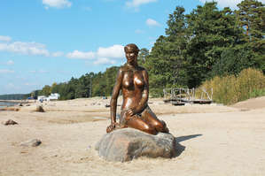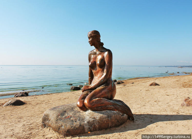 На песчаном берегу Финского залива в районе посёлка Комарово скучает на камне одинокая дева.