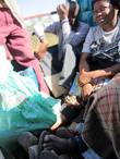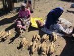 Бабки продают маниоку. Та, что справа, спряталась от камеры. Маниоку едят и сырую, и вареную. Сырая маниока похожа на кокос, а вареная — на картошку.