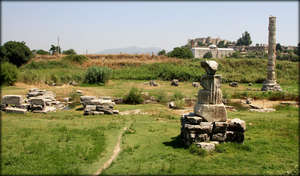 Третье место я посетил в июле 2014 года. Когда то здесь стоял храм Артемиды. На сегодняшний день там практически ничего нет. Небольшое болотце, несколько блоков и одна высокая, восстановленная из обломков колона, на которой аисты свили свое гнездо.