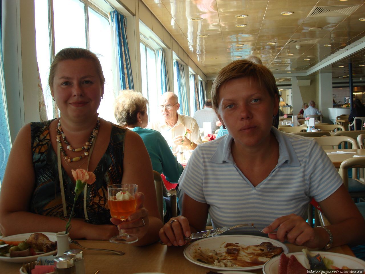 Вернемся к капитану. К нему уже очередь из разряженных-припараженых пассажиров. Никто, впрочем, не нервничает, не за колбасой же в 90-ые в Москве. Продвигаемся потихоньку. Стараясь достойно выражаться разглядывая окружающих. Эти – в колясках – тоже в бальных платьях. Бриллианты сияют. Мужчины в смокингах, есть шотладцы – по юбкам сразу видно. На каждом углу – фотостоп. То на фоне лестницы, то звездное небо растянули. То по одному, то парами, то групповой портрет. И вот апогей – фото с капитаном! Все. Рукопожатие. Рашен?! О-о-о, очень приятно. Взаимно. Проходим в концертный зал, официант предлагает на выбор шампанское, вино, коктейль. Усаживаемся. Кто первый сел – тому больше достается. Допил бокальчик – если отловишь разносчика – получишь новый! Сегодня за все платит капитан. Когда все пассажиры расселись, капитан представил команду и предложил перейти в ресторан на праздничный ужин. С удовольствием!
