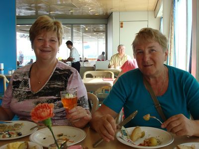 Осмотрелись, ручную кладь разместили и перед встречей с чемоданами кинулись подкрепиться. Знаете, в этом круизе все впервые. Вот наша первая трапеза в ресторане Lido. Конечно, это место стало нашим любимым и получило кличку «У Лиды», но позже было переименовано в тренаЖОРный зал. В руках у нас бокал с желе. Единственное, что не понравилось – просто не любим мы желе. Но красиво!