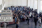 "Шереметьево-2". Внутренний интерьер зала вылета. Большепролётные стальные конструкции дают большую просторность и обеспечивают лёгкое ориентирование пассажиров. На полезной площади в 85 тыс. кв. метров размещены устройства по оформлению и регистрации пассажиров и багажа, а также гастрономические предприятия, торговые ряды, помещения для заседаний и рабочие места для 3000 человек обслуживающего персонала.