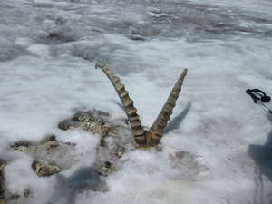 Высшая точка Монгун-Тайги. Яркое белое безмолвие: солнце, снег, безветрие, причудливая горка из подношений – ленточки, череп архара с огромными витыми рогами и… боксерские перчатки. Синее небо — лишь пятно над вершиной. Вокруг нее глыбятся тучи. Пора спускаться вниз.