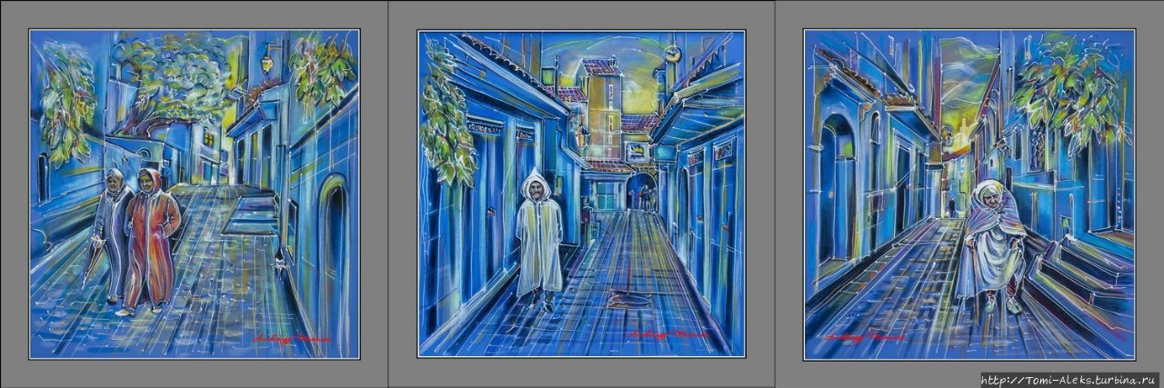 Здесь мы видим весь триптих. Я специально использовал для картин синюю ткань — французский креп, из которой женщины любят шить платья. А нарисованы все три картины корейской масляной пастелью и контурами по ткани. Вот такая эклектика. Интересно, что город определенную часть своей истории был частью испанского Марокко, центром которого был средневековый Тетуан.