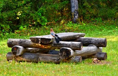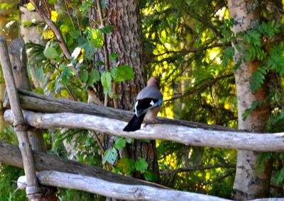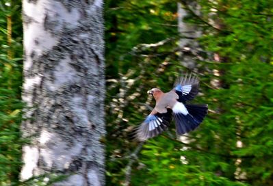 Сойка очень пугливая птица, поэтому обычно удаётся увидеть только её хвост, когда она уже улетает,