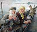 А вот! Взять основной своей темой простую русскую деревню (возможно, чем-то похожую на ту, в которой вырос сам художник). Скромные дома, речка, белая церквушка на горизонте, и персонажи – старики да старушки, живущие здесь своей простой, бесхитростной жизнью. Какие у них развлечения? В снежки поиграть, с горок покататься, борща поесть, да чайку попить, со старухой своей в стогу поваляться, да на дереве в обнимку посидеть…