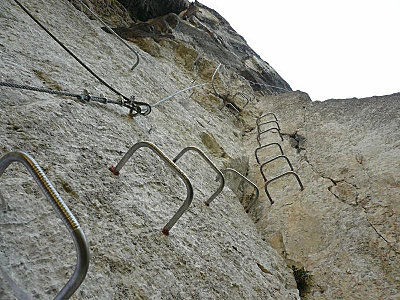 Может быть кто-то и знает, что это такое, для тех, кто первый раз слышит — поясню. Википедия говорит следующее: скальный участок, специально оборудованный металлическими конструкциями, помогающими преодолевать его с большей скоростью и меньшими затратами энергии, чем при скалолазании в его обычном понимании. Как правило, этот участок оборудован страховочным канатом или цепью, идущими вдоль этого участка и фиксированными на скале находящимся на некотором расстоянии друг от друга стальными анкерами. Упоры для ног — либо естественные (скала), либо стальные скобы, штыри или рифлёные пластины небольшого размера.