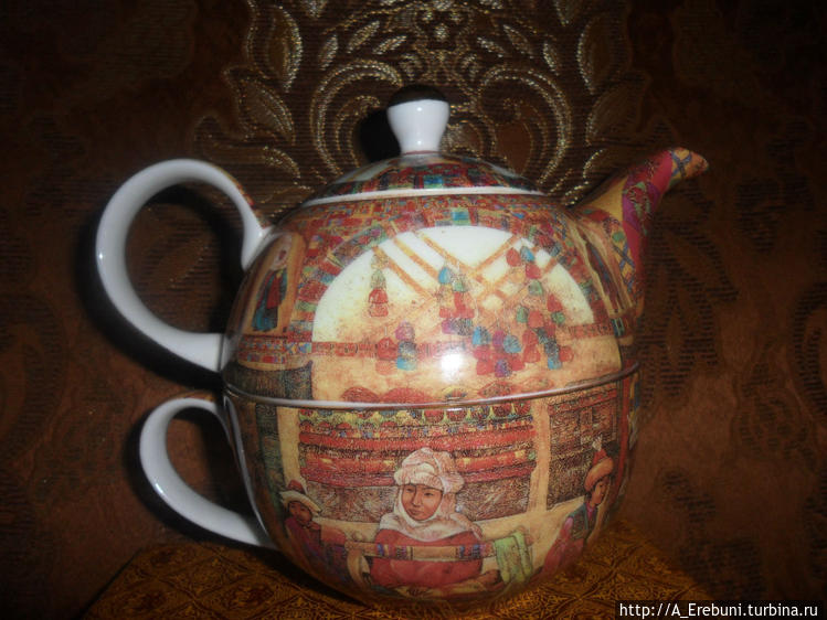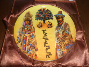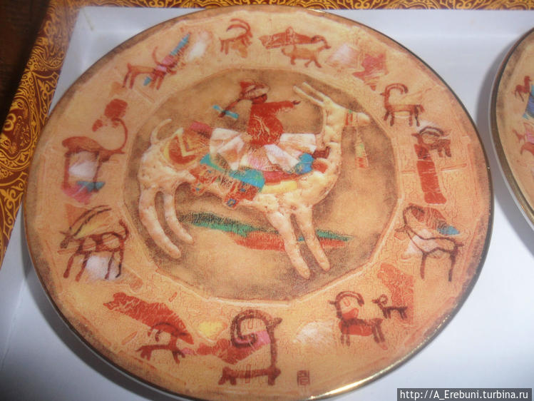 *Декоративная тарелка "Я — казах"*. Материал: фарфор Fine Porcelain, золотая деколь. Скорее всего автор рисунка на тарелке — известная казахстанская художница Нели Бубэ. Лейтмотивом ее выдающихся работ является наследие богатой кочевой культуры казахов: обычаи, традиции, национальные костюмы, предметы быта.