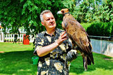 И хотя желающих было немного, пришлось ожидать, к птицам допускали по одному человеку, вероятно, что б уследить за остальными пернатыми, впрочем, хищники вели себя вполне мирно, на людей не кидались. Из числа представленных, больше всех мне приглянулся беркут, вероятно, своими размерами, как ни как, а самый крупный из обширного рода орлов. Когда подошла моя очередь, молодой человек подал мне перчатку из очень толстой кожи, затем надел на голову птицы шапочку, что б хищник не видел, с кем дело будет иметь, и осторожно посадил на мою руку.