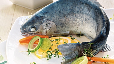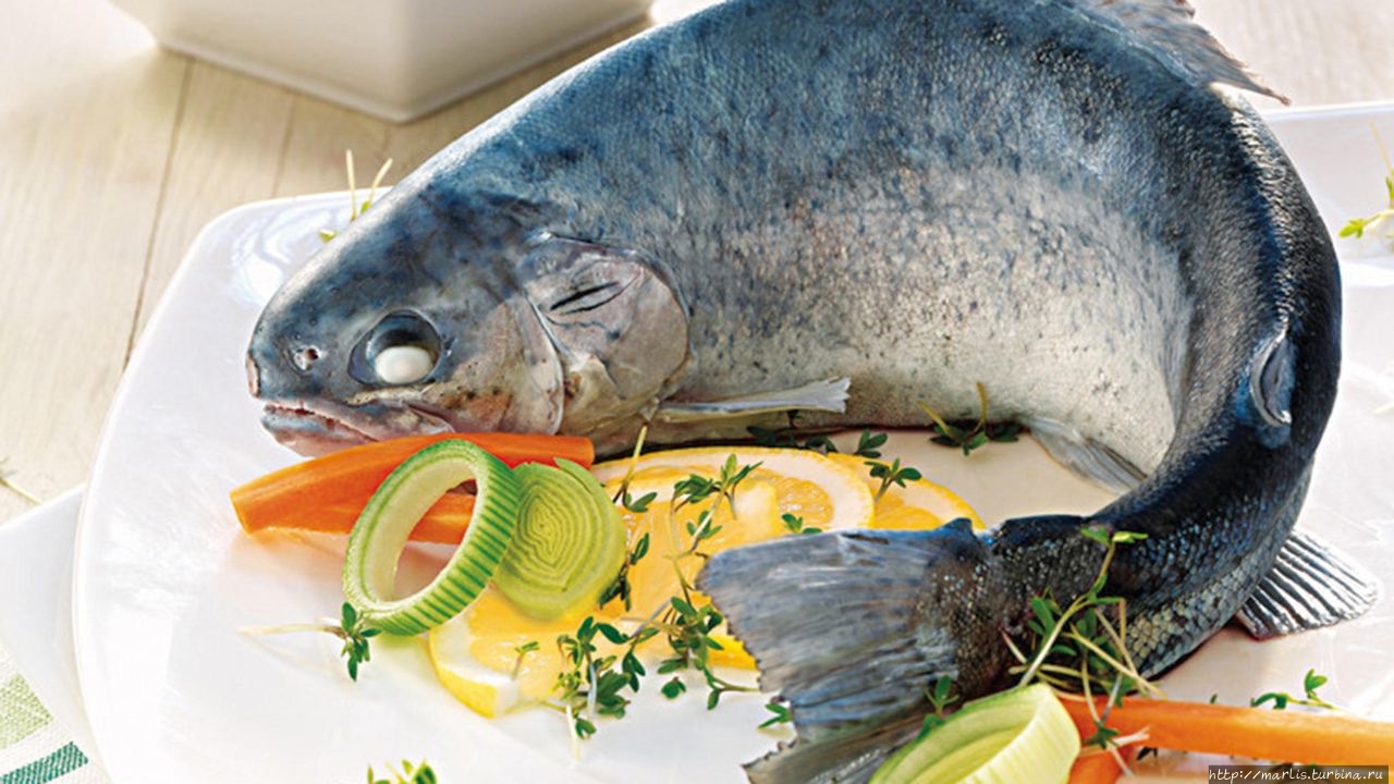 А теперь — еще одно блюдо с винным оттенком. Forelle "Blau" — синяя или пьяная форель. Это вареная форель. Kак вы можете догадаться ее тоже варят в винном маринаде. А чтобы придать ей синеватый оттенок, перед варкой ее поливают кипящим винным уксусом.