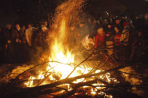 А вечером того же дня при заходе солнца народ собирается у церкви и приносит с собой собранный бадник, который складывается в одну кучу и зажигается. Поджигание совместного бадняка означает приход Нового года и восход нового солнца, а пепел, унесенный в небо, означает плодородие. Обычай собирания «бадняка» относится ко времени рождения Исуса Христа, когда волхвы набрали сухих веток для того, чтобы разжечь костер и тем самым согреть Спасителя и его маму.