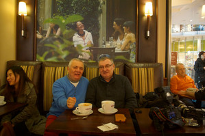 В отступлении от предыдущих регламентов и протоколов мы с Валерием располагаемся за столиком не с традиционными кружками пива, а с большими чашками кофе, т.к. «Палладиум» совсем не то место, где пьют настоящее чешское пиво. Но это нисколько не омрачает удовольствия от встречи и знакомства, тем более, что вскоре к нам присоединяется жена Валерия, Ирина, которая и сделала это памятное фото: