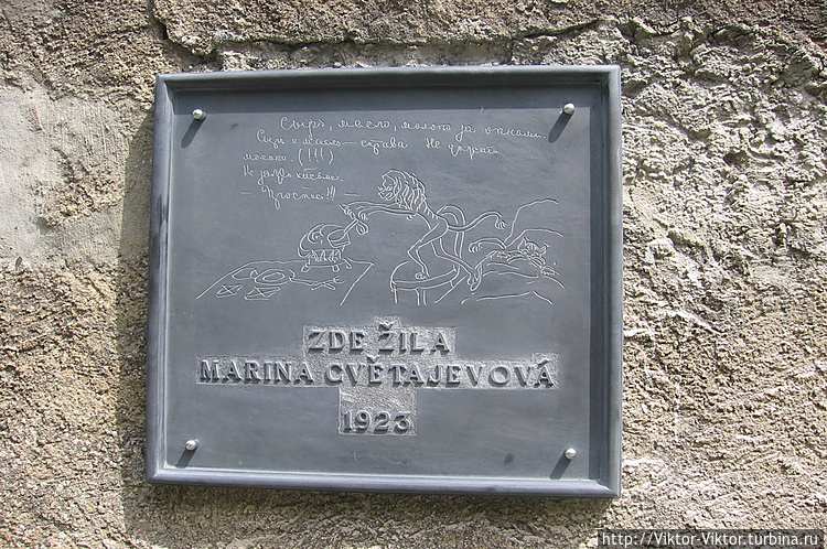 Из письма Цветаевой, написанного в этом доме во Вшенорах под Прагой: «Крохотная деревенька... Две лавки... Костел с кладбищем... В каждом домике непременно светящееся окно в ночи: русский студент! Живут впроголодь, живут Россией, мечтой о служении ей».
